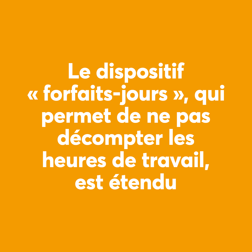 Dans un communiqué du 17 février, l'Ugict-CGT a pointé l'extension et l'assouplissement du forfait jour qui touche déjà un cadre sur deux. Alors que la France a été condamnée à 4 reprises par le Comité européen des droits sociaux, que la Cour de cassation a annulé 11 accords de branches et appelé le législateur à se mettre en conformité avec le droit européen, le projet de loi prévoit que les entreprises de moins de 50 salariés n’auront plus besoin d’accord collectif et que les 11 heures de repos consécutifs obligatoires pourront être fractionnées, au mépris des normes européennes et du droit à la déconnexion.